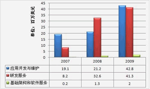 中國IT服務企業承擔的離岸IT服務項目主要是軟件外包。這些業務包括應用程序開發和管理、產品開發、包裝解決方案服務、全球化和本地化服務等。這些客戶包括外國公司和外國公司在中國的分支機構/子公司。中國的離岸軟件外包市場近年來也發展迅速。根據IDC 2010年7月的報告,中國離岸軟件市場規模將從2009年的28億美元增長到2014年的76億美元,年復合增長率為22.4%。