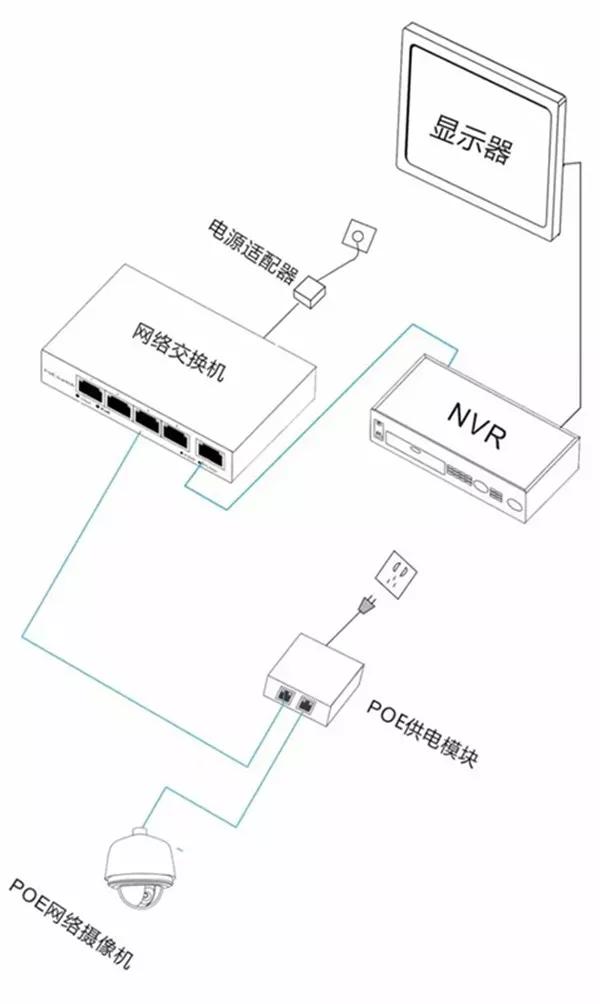 本方案中交換機與PoE供電器相連,PoE供電器給網線加電,傳輸到終端。該方案有利于擴大原有布線網絡,對原有網絡無影響。